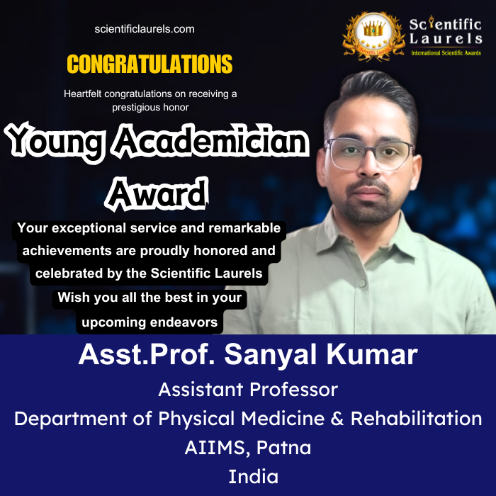 Asst. Prof. Sanyal Kumar is highly eligible for the Young Academician Award in Scientific Laurels owing to his strong early-career trajectory, multi-disciplinary certifications, impactful research output (25 publications), national and international conference participation, awarded fellowships, academic leadership in PMR, and consistent contributions to professional societies and community-based rehabilitation. His achievements reflect the hallmark qualities of a rising academician committed to advancing scientific and clinical excellence in rehabilitation medicine.
