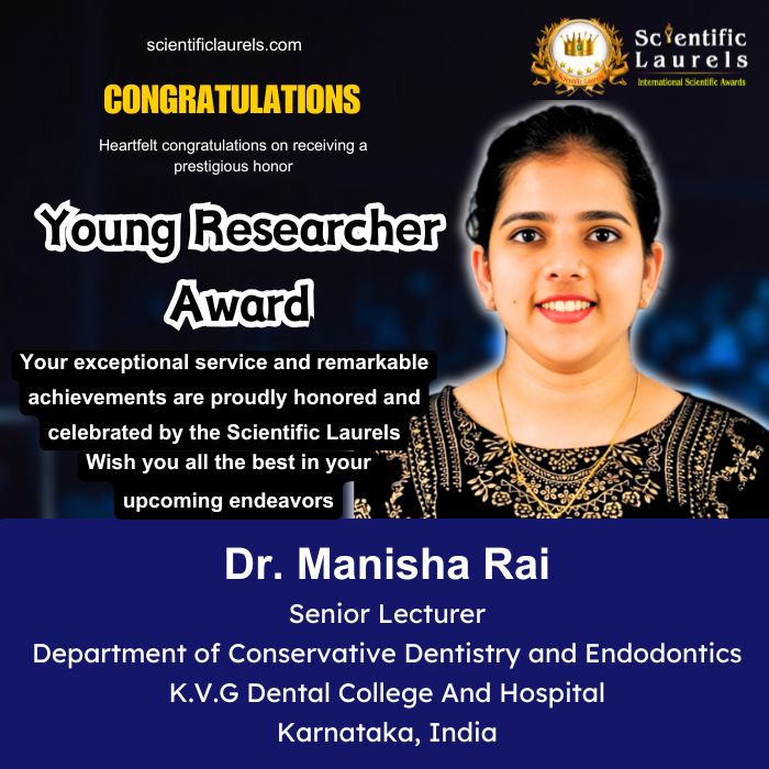 Dr. Manisha Rai is highly eligible for the Young Researcher Award (Scientific Laurels) due to her substantial research output at an early career stage, publications in reputed journals, active participation in scientific conferences, and multiple national and international recognitions. Her interdisciplinary research approach, adoption of emerging technologies like AI in dentistry, and consistent academic excellence align strongly with the objectives of the Young Researcher Award, which honors innovation, research quality, and future scientific leadership.