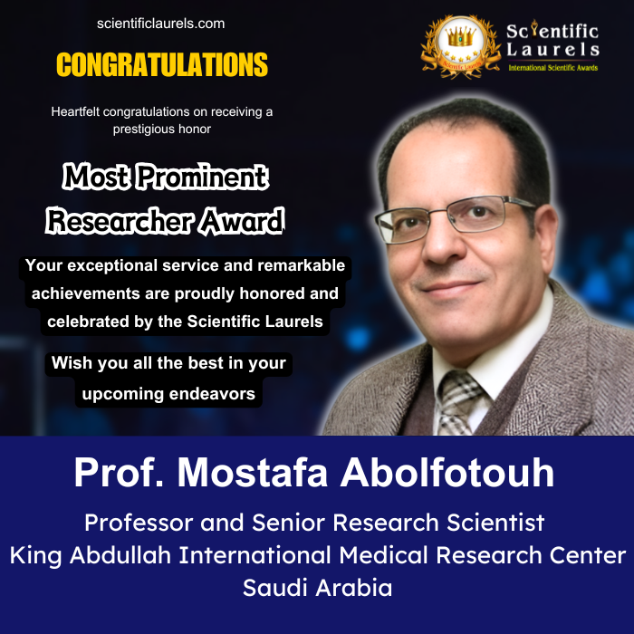 Prof. Mostafa Abolfotouh is highly eligible for the Most Prominent Researcher Award due to his outstanding and sustained contributions to public health and medical research. With an exceptional record of over 270 peer-reviewed publications, 85 research projects, and authorship of 10 books, he has demonstrated remarkable scholarly productivity and impact. His affiliation with leading institutions such as the King Abdullah International Medical Research Center, the King Saud bin Abdulaziz University for Health Sciences, and Alexandria University reflects his leadership in advancing scientific research. Additionally, his international training, prestigious recognitions—including the honorary membership from the International Society for Prevention of Child Abuse and Neglect—and active participation in over 260 scientific events highlight his global influence and commitment to knowledge dissemination. His excellence in research, mentorship, and scientific leadership strongly justifies his selection for this distinguished award.