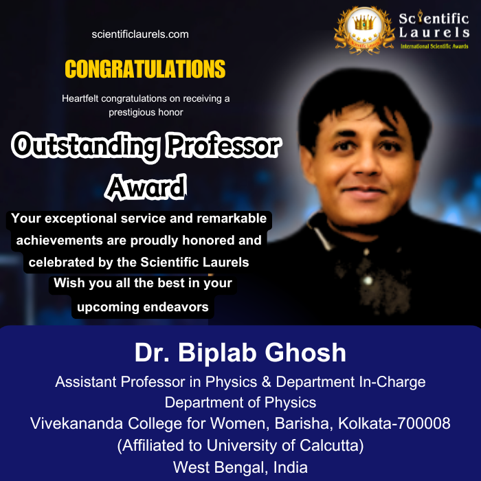 Dr. Biplab Ghosh is highly eligible for the Outstanding Professor Award (Scientific Laurels) owing to his distinguished academic career spanning over two decades in the field of Physics. Since July 2002, he has demonstrated excellence in teaching, research, and academic leadership as an Assistant Professor (Stage II) and Department In-charge. His scholarly contributions include 22 publications, along with several ongoing research works, reflecting sustained engagement in scientific advancement. He has actively participated in 91 conferences, symposia, and workshops, showcasing his commitment to knowledge exchange and professional visibility. Furthermore, his continuous academic development through 19 refresher courses, FDPs, and orientation programs highlights his dedication to pedagogical and professional excellence. His achievements are further strengthened by prestigious recognitions such as the DST Junior Research Fellowship, CSIR-UGC Junior and Senior Research Fellowships, and the International Academic Excellence Award 2026. His combined excellence in teaching, research output, academic involvement, and leadership makes him a highly deserving candidate for this prestigious award.