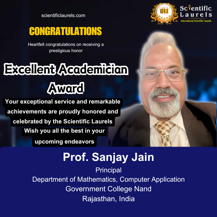 Prof. Sanjay Jain is highly eligible for the Excellent Academician Award (Scientific Laurels) owing to his outstanding and sustained contributions to higher education, research, and academic leadership. With a distinguished career culminating in his role as Principal under the Commissionerate of College Education, Ajmer, he has demonstrated excellence in teaching and institutional development. His strong research profile, comprising 133 publications and multiple funded projects as Principal Investigator, reflects his deep commitment to advancing knowledge in mathematics and interdisciplinary domains. His innovative work is further evidenced by several patents in emerging fields such as Artificial Intelligence, Blockchain, and IoT. Prof. Jain’s achievements have been widely recognized through numerous prestigious national and international awards, including the Prof. P. C. Mahalanobis Award, State Level Higher Education Teacher Award, and National Teaching Excellence Award. His fellowships in reputed professional bodies and global academic exposure further reinforce his academic stature. Collectively, his exceptional contributions to academia, research innovation, and educational leadership make him a highly deserving candidate for this honor.