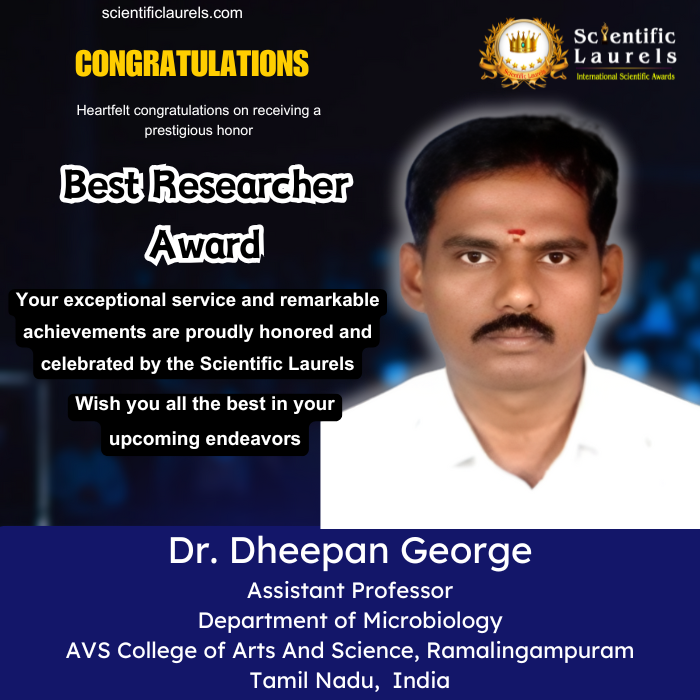 Dr. Dheepan George has authored 15 research papers published at both national and international levels, reflecting a consistent record of quality research output. His works have earned an H-index of 3, I-index of 2, and an average impact factor of 3.5, showcasing the relevance and influence of his contributions in microbiological sciences.