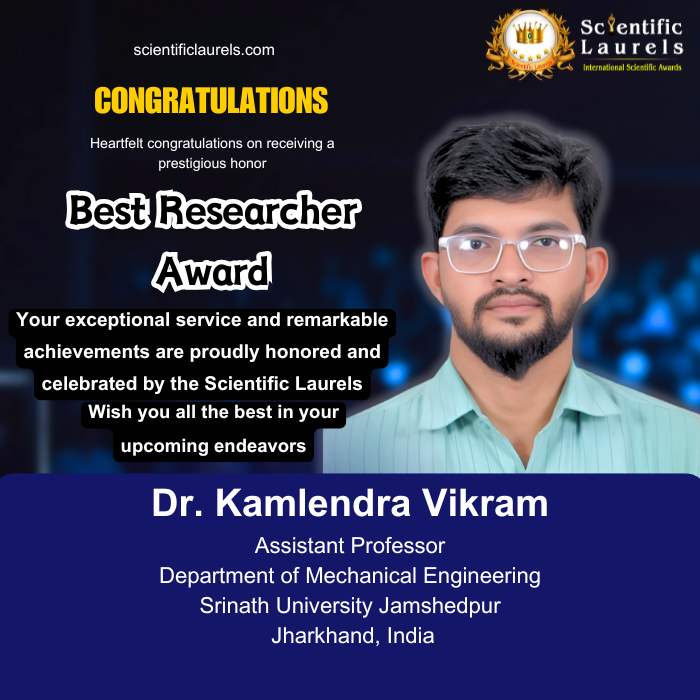 Dr. Kamlendra Vikram is highly eligible for the Best Researcher Award (Scientific Laurels) based on his consistent and impactful research contributions. His profile demonstrates a strong combination of quality publications, international conference participation, and recognized research excellence, including prestigious awards. His achievement of publishing multiple Scopus/WoS indexed papers as a first author within a short span highlights his research capability, originality, and dedication. Furthermore, his recognition through the Dr. APJ Abdul Kalam Research Award and Best Paper Award underscores his academic excellence and innovation. These accomplishments collectively make him a deserving candidate for the Best Researcher Award.