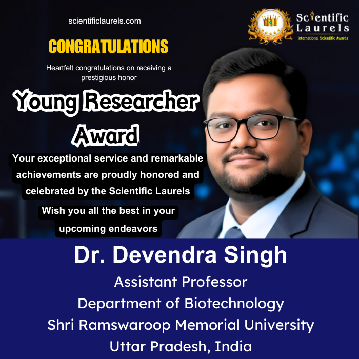 Dr. Devendra Singh is a distinguished academician and researcher in the field of biotechnology and bio-based materials, currently serving as an Assistant Professor at Shri Ramswaroop Memorial University (SRMU), Barabanki, Uttar Pradesh. With a career spanning over four years of academic and postdoctoral experience, he has previously worked as an Assistant Professor at B.N. College of Engineering and Technology, Lucknow, and as a Postdoctoral Fellow at NIT Warangal.