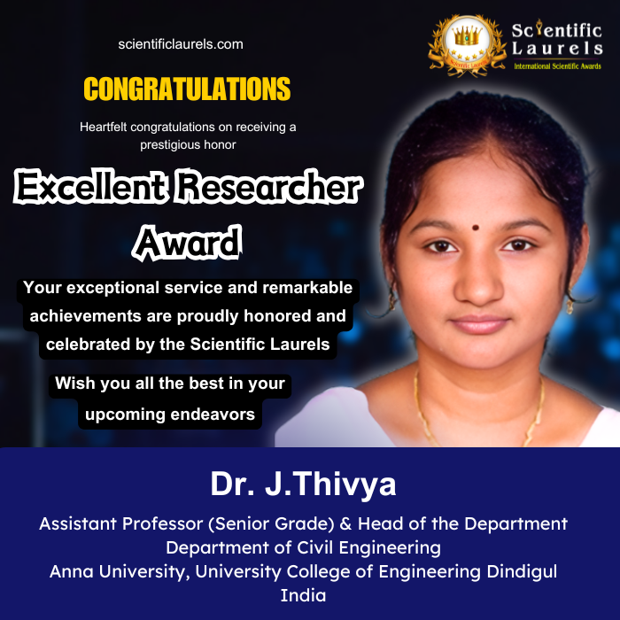 Dr. J. Thivya is highly eligible for the Excellent Researcher Award in Scientific Laurels based on her strong academic and research profile. With 35 peer-reviewed journal publications, multiple authored books, and significant contributions to innovative research through patents (including an international award), she demonstrates outstanding research productivity and impact. Her active participation in conferences, organization of FDPs, and continuous professional development further strengthen her academic profile. Additionally, her interdisciplinary research focus on sustainable construction and environmental engineering aligns well with current global research priorities. Her consistent contributions to knowledge creation, innovation, and student mentorship make her a deserving candidate for this prestigious recognition.
