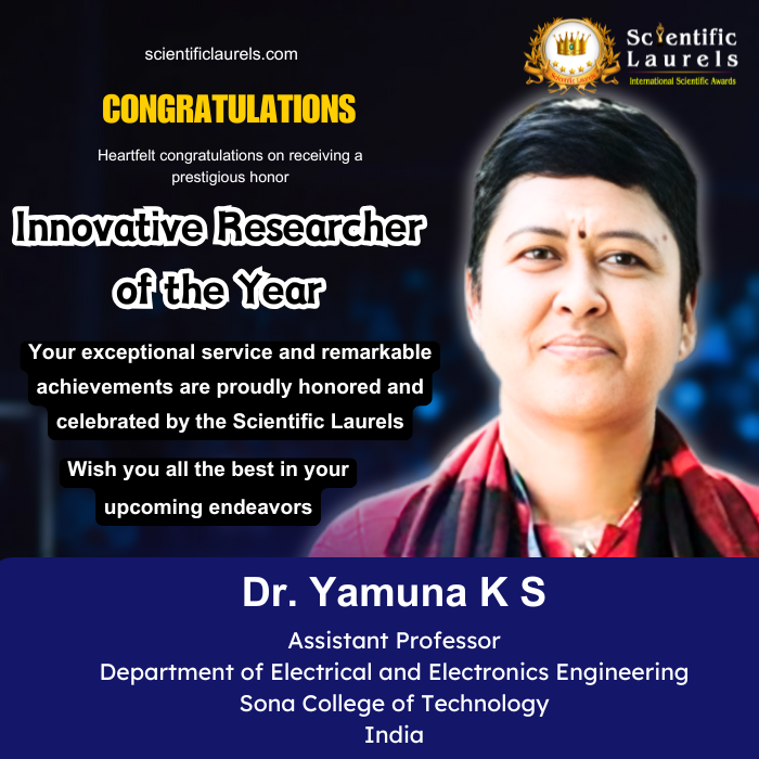 Dr. Yamuna K. S embodies the spirit of an Innovative Researcher through her consistent contributions to applied research, patent-driven innovation, and interdisciplinary technological advancement. Her work seamlessly integrates AI, IoT, renewable energy, and human-centric design, reflecting a forward-thinking approach aligned with global scientific and societal needs.