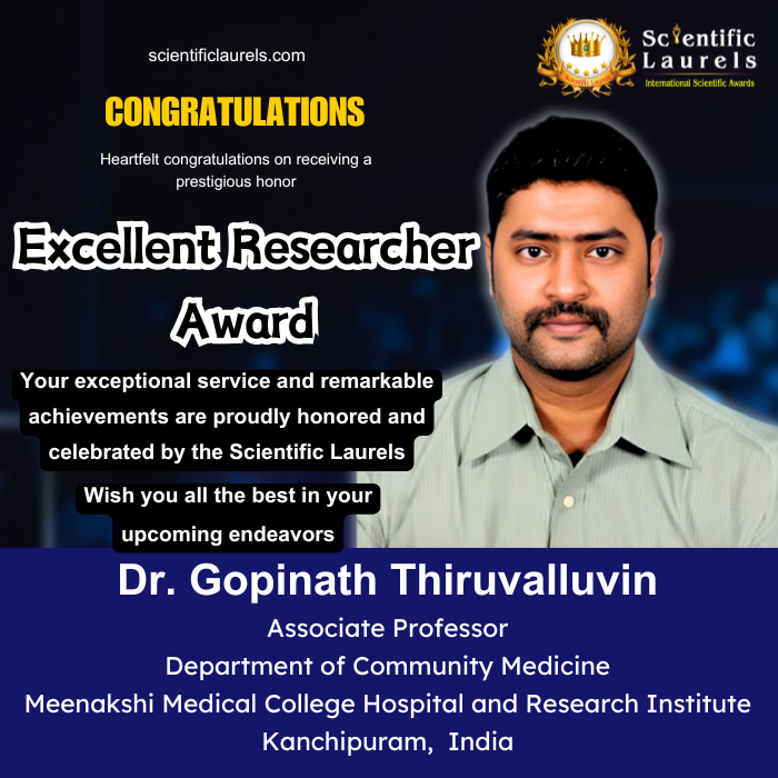 Dr. Gopinath Thiruvalluvin is a public health academician and clinician currently serving as Associate Professor, Department of Community Medicine, Meenakshi Medical College Hospital & Research Institute (MMCHRI), Kanchipuram, Tamil Nadu. He joined the institution as an Assistant Professor in May 2018 and was promoted to Associate Professor in June 2022.