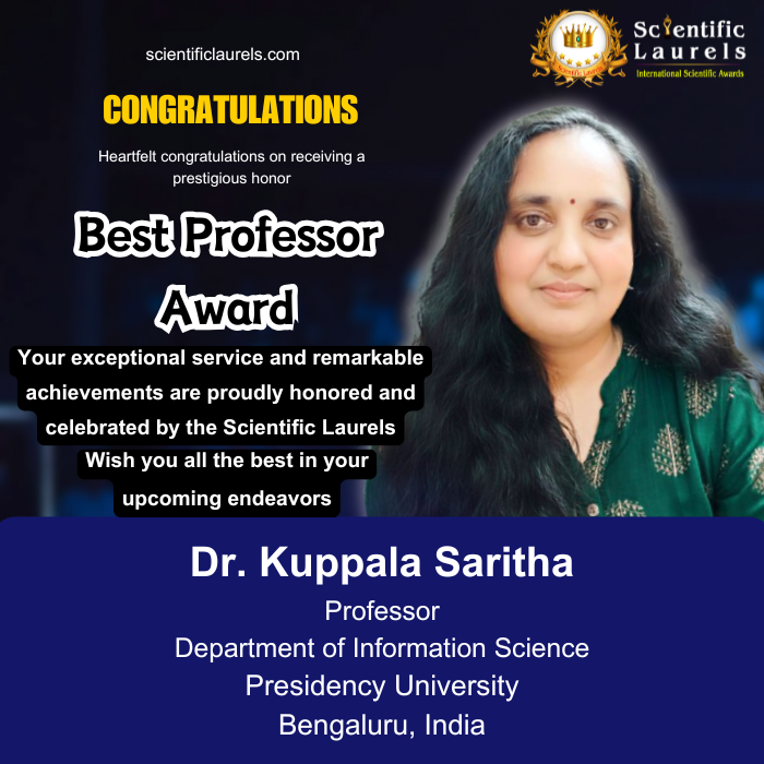Dr. Kuppala Saritha is highly eligible for the Best Professor Award in Scientific Laurels due to her outstanding academic career, consistent research contributions, significant publication record, active involvement as a reviewer for international journals and Springer conferences, patented innovation, and recognized excellence in teaching. Her dedication to professional development, mentorship, and contribution to emerging technologies strongly align with the award’s criteria, making her a deserving candidate for this prestigious honor.
