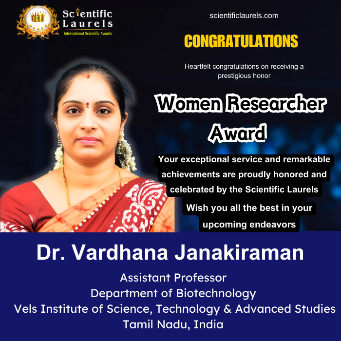 Dr. Vardhana Janakiraman is highly eligible for the Women Researcher Award (Scientific Laurels) due to her consistent and impactful contributions to scientific research, academic leadership, and mentorship. With a strong publication record, internationally recognized editorial and jury roles, interdisciplinary research expertise, and active involvement in guiding postgraduate and doctoral scholars, she exemplifies excellence as a woman researcher. Her sustained commitment to advancing biotechnology and emerging scientific domains, coupled with prior national-level recognition and continuous professional development, makes her a deserving candidate for this prestigious award honoring women leaders in science.