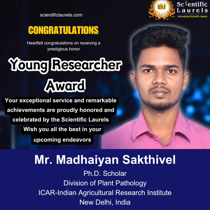 Mr. Madhaiyan Sakthivel is an emerging agricultural researcher specializing in Plant Pathology. He completed his M.Sc. (Ag) in Plant Pathology at Visva-Bharati University, where he secured the First Position in the university examination, earning the Sudip Kumar Lahiri Memorial Foundation Day Award (2022). His academic excellence continued as he successfully cleared major national-level competitive examinations such as the ASRB-NET (2023) in Plant Pathology and the ICAR AICE-JRF/SRF Examination (2024) with an impressive All India Rank 22. His consistent performance in academics and research has been recognized through multiple commendations, including a Certificate of Appreciation from Visva-Bharati (2025).