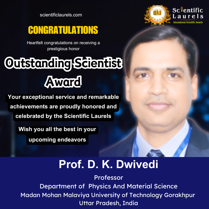Prof. D. K. Dwivedi’s exemplary academic journey, prolific research output, innovation in sensing and optoelectronic technologies, and leadership in major national projects clearly establish his eligibility for the “Outstanding Scientist Award in Scientific Laurels.”