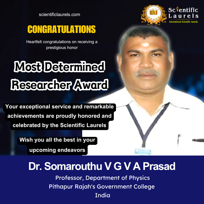 Dr. Somarouthu V. G. V. A. Prasad exemplifies determination, consistency, and excellence in research. His longstanding academic service, extensive publication record, organization of impactful seminars and workshops, and recognition through national honors make him highly deserving of the “Most Determined Researcher Award”.