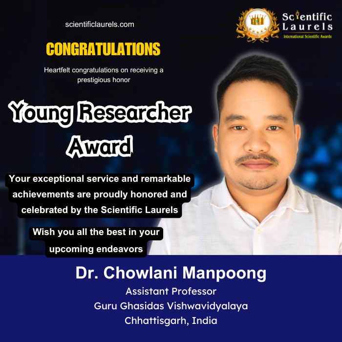 With a strong research background, significant publications, international exposure, patents, project leadership, and multiple national & international recognitions, Dr. Chowlani Manpoong is highly eligible for the Young Researcher Award under Scientific Laurels.