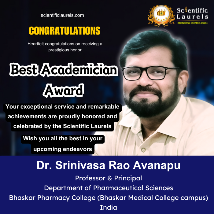 Dr. Srinivasa Rao Avanapu’s sustained excellence in teaching, innovative research, leadership in higher education, and significant contributions to scientific knowledge through patents, publications, and conference presentations make him highly eligible for the Best Academician Award in scientific laurels. His achievements reflect a blend of academic rigor, research innovation, and community engagement, positioning him as a leading figure in academic and pharmaceutical research.