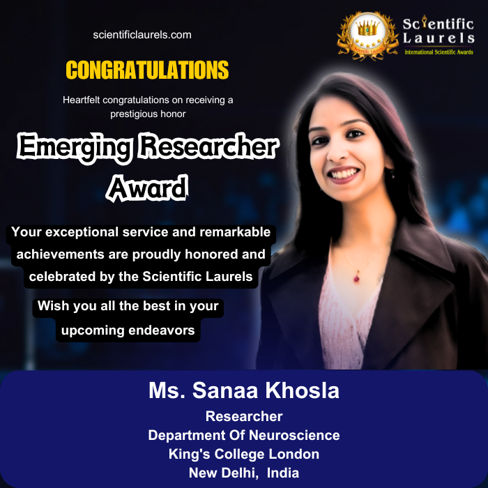 Given her strong record of published research, ongoing manuscripts, advanced laboratory expertise, and academic engagement, Ms. Sanaa Khosla demonstrates the qualities of an emerging leader in neuroscience research. Her contributions to both experimental neuropathology and psychological domains of cognitive science reflect innovation, ethical rigor, and translational relevance. These achievements establish her eligibility for the Emerging Researcher Award in Scientific Laurels, recognizing her as a promising scientist at the forefront of neurodegeneration and psychology research.