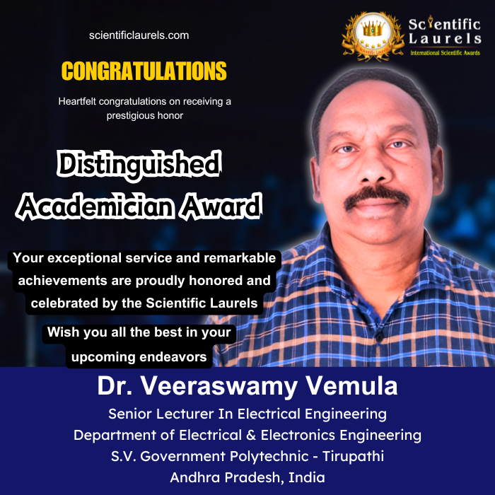 With a career dedicated to academic leadership, engineering education, research, and student mentorship, supported by over four decades of teaching excellence, 21 publications, pioneering departmental leadership roles, and more than 40 national & international honors, Dr. Veeraswamy Vemula stands as an outstanding candidate for the Distinguished Academician Award in Scientific Laurels. His exceptional achievements exemplify the qualities of a visionary educator, researcher, and academic leader.
