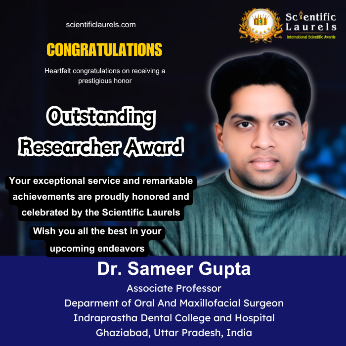 With his distinguished record of 30+ high-impact publications, multiple patents, advanced research in AI, regenerative dentistry, and robotic-assisted surgeries, along with significant clinical expertise and global recognition, Dr. Sameer Gupta embodies the qualities of an outstanding researcher in oral and maxillofacial sciences. His consistent contributions to innovation, patient care, and academic development make him highly deserving of the Outstanding Researcher Award in Scientific Laurels.