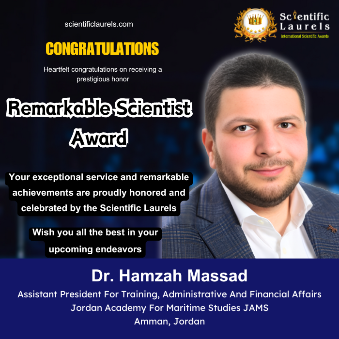 Dr. Hamzah Massad’s prolific career, combined with his transformational impact in quality assurance and maritime education, clearly establishes his eligibility for the Remarkable Scientist Award in Scientific Laurels. His consistent leadership in capacity building, academic excellence, and scientific advancement across national and international platforms exemplifies the award's standards of scientific achievement, innovation, and professional service.