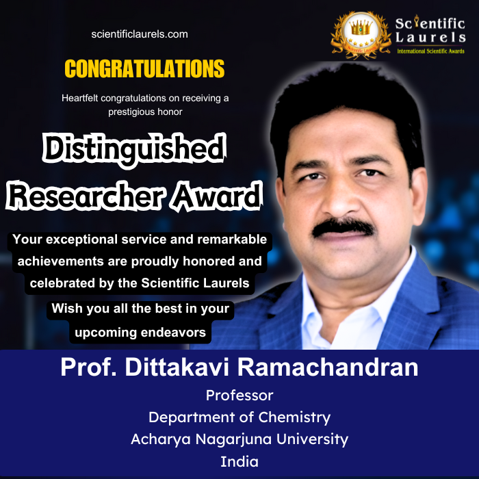 With 227 publications, 4 patents, 5 books, 68 conference participations, and guidance to more than 50 Ph.D. scholars, Prof. Dittakavi Ramachandran has established himself as a leader in chemical sciences research and education. His outstanding contributions to fundamental and applied chemistry, scientific innovations, and international collaborations make him an eminently deserving recipient of the Distinguished Researcher Award in Scientific Laurels.