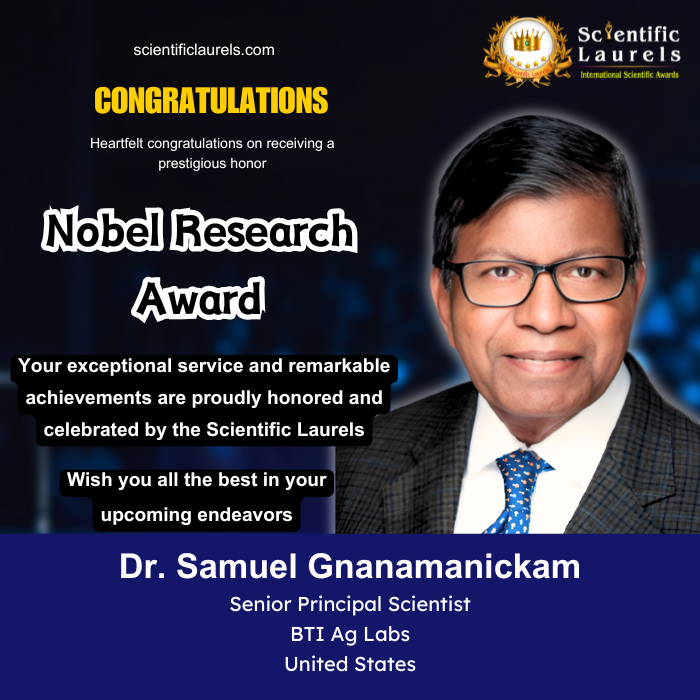 Dr. Gnanamanickam’s groundbreaking contributions to plant pathology, disease-resistant crop development, and microbial biotechnology position him as a strong candidate for prestigious scientific awards, including the Nobel Research Award in Scientific Laurels. His innovations have significantly impacted global food security, sustainable agriculture, and biotechnology advancements, making him a leader in the field of agricultural sciences.