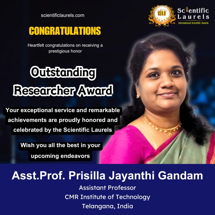With her exemplary teaching record, significant research contributions, and a passion for academic innovation, Mrs. Prisilla Jayanthi Gandam is a deserving recipient of the Outstanding Researcher Award under Scientific Laurels. She continues to inspire and mentor the next generation of computer science professionals while contributing to the advancement of the field.