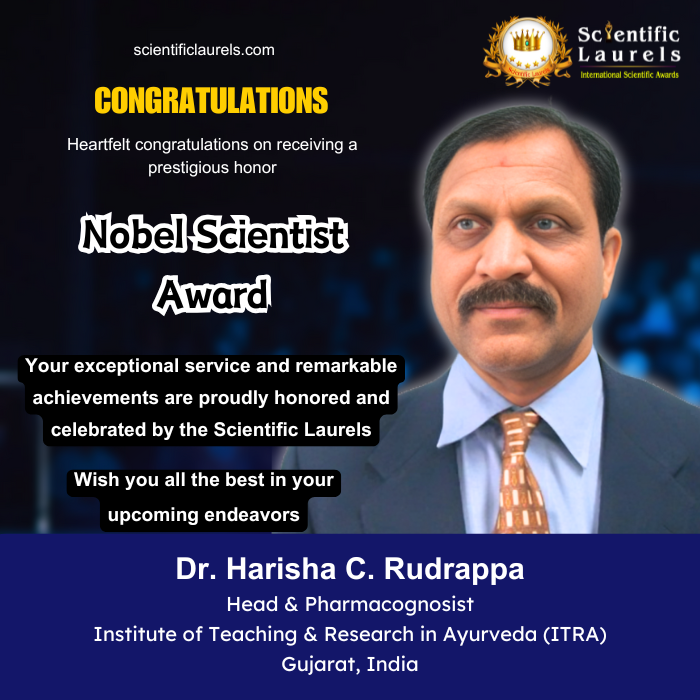 Dr. Harisha C. Rudrappa’s extensive research, scholarly contributions, and commitment to the field of Pharmacognosy make him a deserving recipient of the Nobel Scientist Award in Scientific Laurels. His groundbreaking work in medicinal plant research and Ayurveda continues to shape the future of natural medicine and phytochemistry.