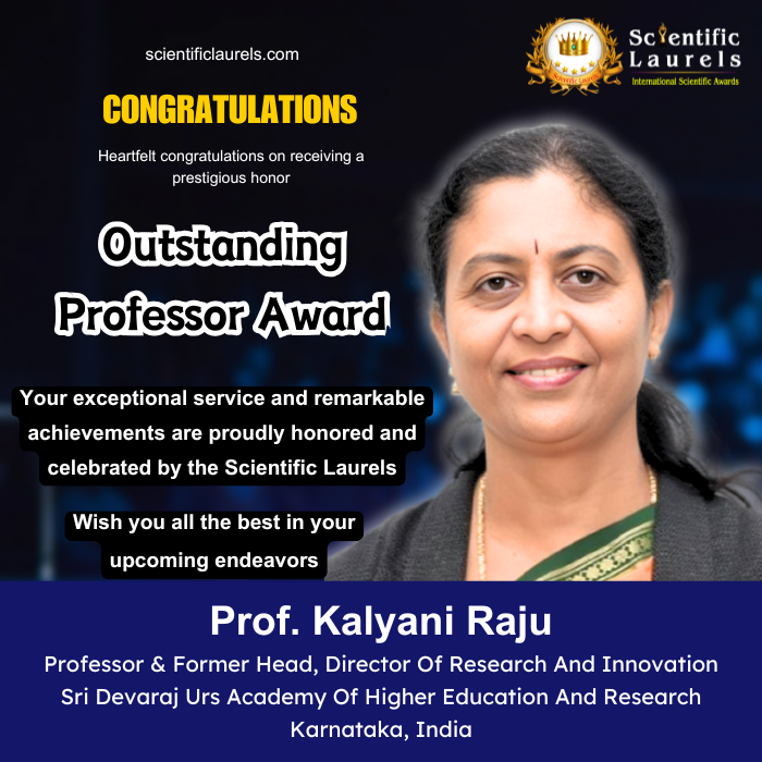 In recognition of her outstanding contributions to pathology, research, and medical education, Prof. Kalyani Raju is eligible to receive the Outstanding Professor Award in Scientific Laurels. Her decades of dedication to medical science, leadership in academia, and commitment to research excellence make her a distinguished recipient of this prestigious honor.