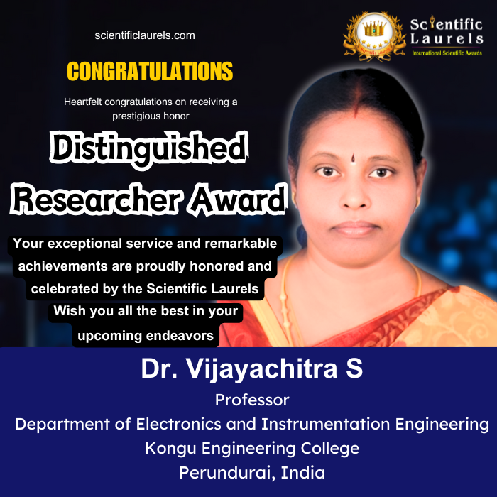 Dr. Vijayachitra’s extensive research publications, patents, funded projects, international recognition, and numerous awards establish her as a highly deserving candidate for the Distinguished Researcher Award in Scientific Laurels. Her consistent contributions to instrumentation, automation, and control engineering, combined with her mentorship and leadership in research, underline her excellence in the field.