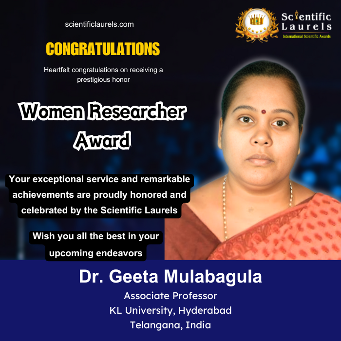 With her consistent record of academic excellence, innovative research, international teaching experience, and recognized contributions in banking and finance, Dr. Geeta Mulabagula is a deserving recipient of the Women Researcher Award in Scientific Laurels. Her dynamic leadership, global exposure, and commitment to impactful education and research establish her as a role model in the academic and research community.