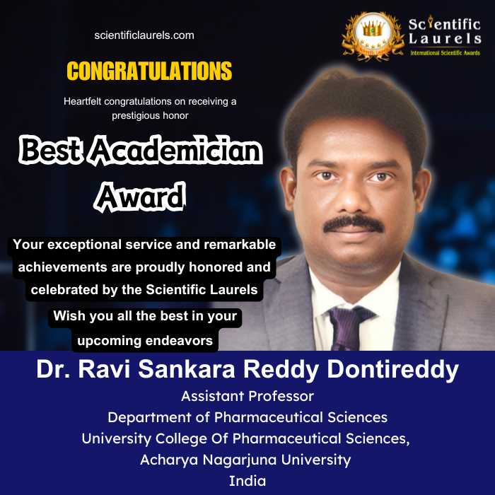 With his two decades of academic service, excellence in teaching, mentoring, and research guidance, leadership in organizing academic events, and recognition through national and international awards, Dr. Ravi Sankara Reddy Dontireddy exemplifies the qualities of an outstanding academician. His contributions to pharmaceutical education, innovative research, and student development make him a highly deserving candidate for the Best Academician Award in Scientific Laurels.