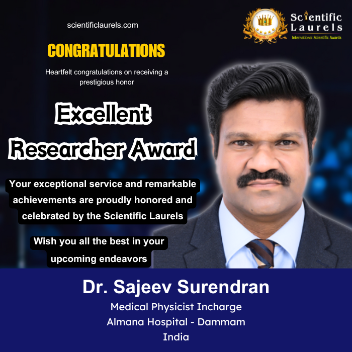 Given his remarkable contributions to medical physics and radiation safety, Dr. Sajeev Surendran is eligible to receive the "Excellent Researcher Award" from Scientific Laurels for his outstanding work in advancing medical science and ensuring patient safety.