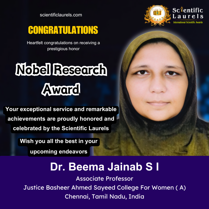 Dr. Beema Jainab S.I's groundbreaking research, extensive academic contributions, and global recognition make her a deserving candidate for the Nobel Research Award in Scientific Laurels. Her innovative work in plant sciences, sustainability, and environmental management has had a profound impact on both academia and industry, establishing her as a leading figure in botanical research and education.
