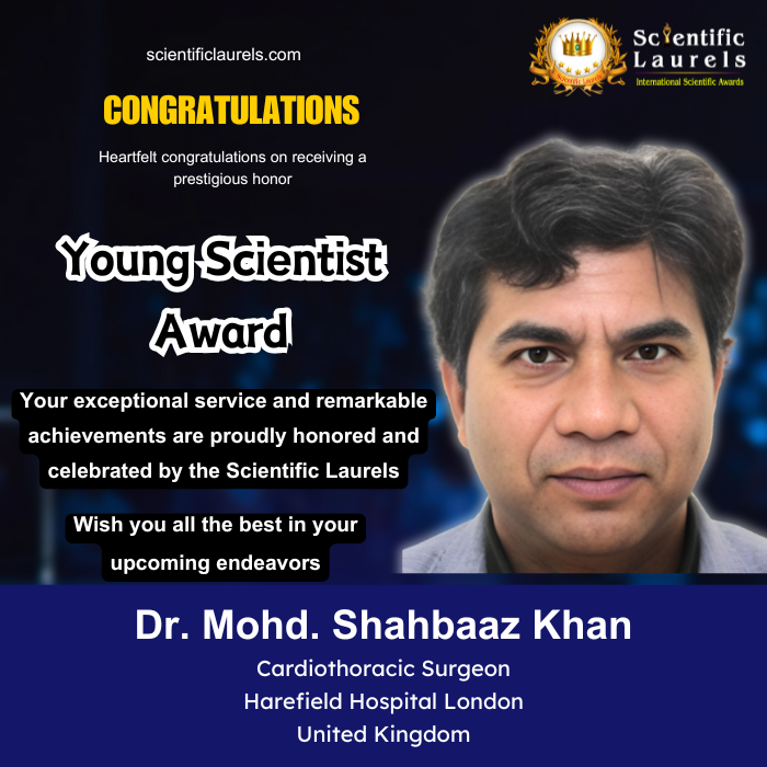 For his exceptional contributions to cardiothoracic surgery, research, and medical education, Dr. Mohd. Shahbaaz Khan is eligible to receive the Young Scientist Award in Scientific Laurels.