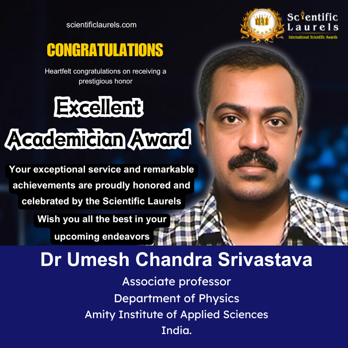 With his longstanding dedication to teaching, active research contributions, participation in international academic platforms, and leadership in organizing scientific events, Dr. Umesh Chandra Srivastava exemplifies the qualities of an excellent academician. His academic rigor, professional service, and commitment to scientific development make him highly deserving of the Excellent Academician Award in Scientific Laurels.