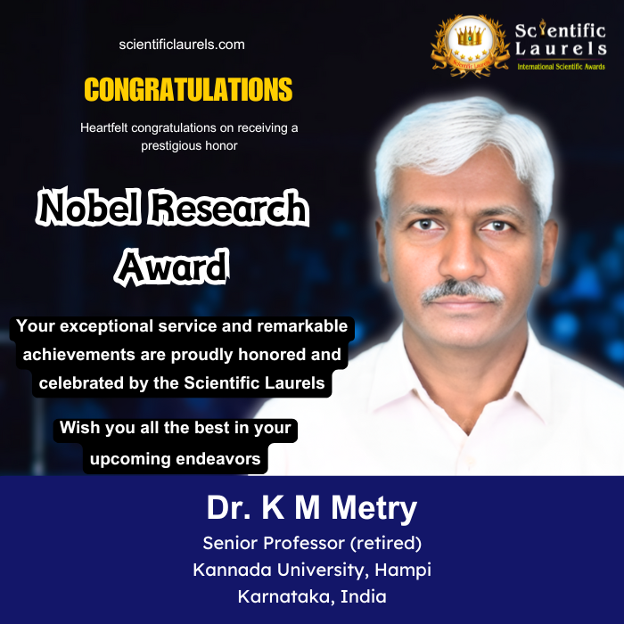 Dr. K M Metry’s outstanding research contributions, academic leadership, and lifelong dedication to tribal and marginalized community studies make him a deserving recipient of the Nobel Research Award in Scientific Laurels. His work continues to shape policies, uplift communities, and advance knowledge in social sciences.