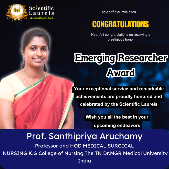 Prof. Santhipriya Aruchamy is a dedicated nursing professional and academician currently serving as Professor and Head of the Department of Medical Surgical Nursing at K.G. College of Nursing, affiliated with The Tamil Nadu Dr. M.G.R. Medical University, Chennai, India. With 19 years and 6 months of teaching experience and 2 years of professional clinical expertise, she has established herself as a dynamic leader in the field of nursing education and practice.