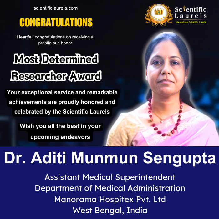 Dr. Aditi Munmun Sengupta is a medical professional with extensive experience in critical care medicine and healthcare administration. She has worked as a Medical Officer in Intensive Care Units of several esteemed hospitals in Kolkata, gaining hands-on expertise in managing critically ill patients and complex hemodynamic conditions. She is currently serving as Assistant Medical Superintendent at Manorama Hospitex Pvt. Ltd., Ranaghat, West Bengal, India, where she contributes to both clinical governance and patient-care excellence.