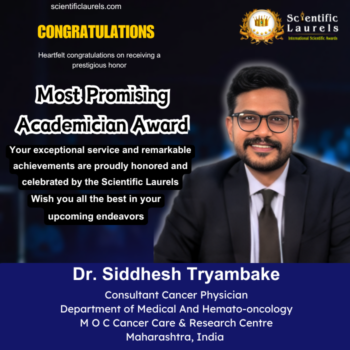 With a growing portfolio of impactful publications, cross-disciplinary research insight, and recognized contributions to clinical oncology, Dr. Tryambake stands as a distinguished candidate for the Most Promising Academician Award in Scientific Laurels.