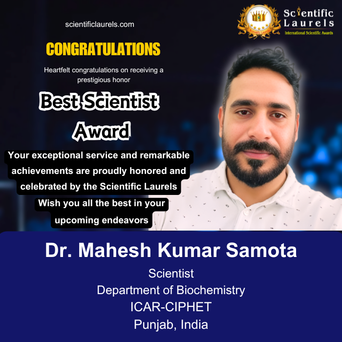 With over four years of dedicated service at ICAR-CIPHET, a strong record of national-level academic achievements, 54+ research publications, authored books and chapters, and multiple national and international awards, Dr. Mahesh Kumar Samota fulfills and exceeds the key criteria for the Best Scientist Award conferred by Scientific Laurels.