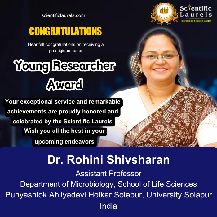 Dr. Rohini Ravindra Shivsharan is an accomplished academician and researcher currently serving as an Assistant Professor (Contractual Basis) at Punyashlok Ahilyadevi Holkar Solapur University Solapur, since August 2023. With a strong foundation in microbiology, biotechnology, and interdisciplinary life sciences, she has consistently demonstrated excellence in teaching, research, and academic leadership. Her academic journey is marked by top university ranks, scholarships, and continuous professional upskilling.