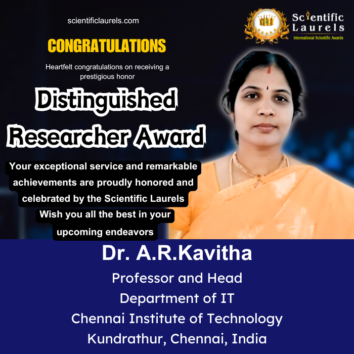 Dr. A. R. Kavitha is highly eligible for the Distinguished Researcher Award in Scientific Laurels due to her exceptional and sustained contributions to scientific research, innovation, and academic leadership. With an impressive record of high-impact publications, multiple patents and grants, successful Ph.D. mentorship, interdisciplinary research excellence, and national-level academic service, she exemplifies the qualities of a distinguished researcher with global impact. Her work bridges theory, application, and societal relevance, particularly in healthcare AI, IoT security, and intelligent systems, making her a deserving and eminent candidate for this prestigious recognition.