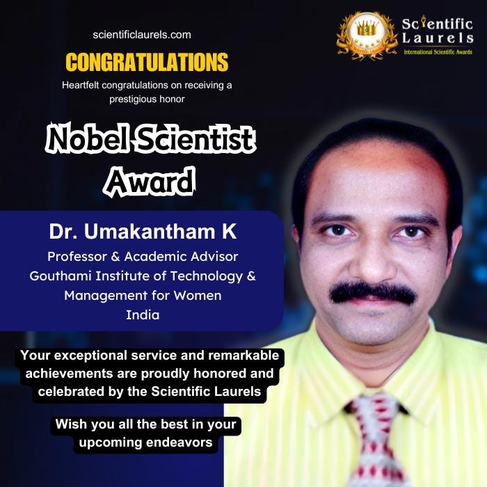 With his wealth of experience, exceptional research contributions, and unwavering commitment to education, Dr. K. Umakantham exemplifies the qualities of a global scientific leader deserving of the Nobel Scientist Award under Scientific Laurels.