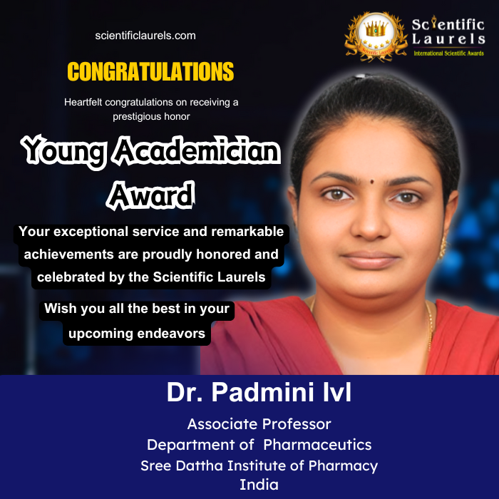 Dr. I.V.L. Padmini’s impressive achievements in research, innovation, and teaching make her a deserving candidate for the “Young Academician Award” under Scientific Laurels. Her sustained contributions to pharmaceutical education, novel drug delivery systems, and herbal research reflect a strong potential for continued excellence and leadership in academia.
