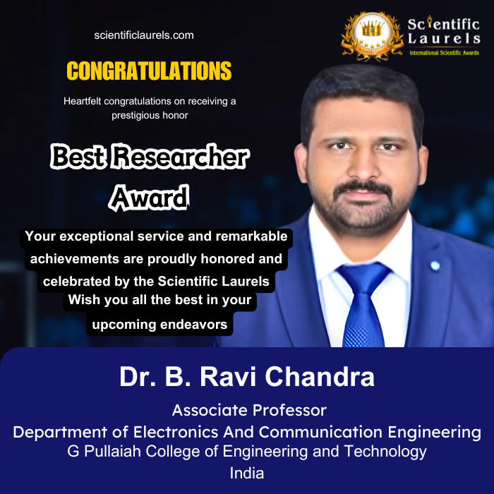 Dr. B. Ravi Chandra is currently serving as an Associate Professor and former Head of the Department at G. Pullaiah College of Engineering & Technology (UGC Autonomous), where he has been contributing since August 29, 2022. With a strong academic foundation and leadership capabilities, Dr. Chandra has demonstrated excellence in teaching, research, and innovation across multiple domains of engineering, particularly in Electronics, Communication, IoT, and Artificial Intelligence.