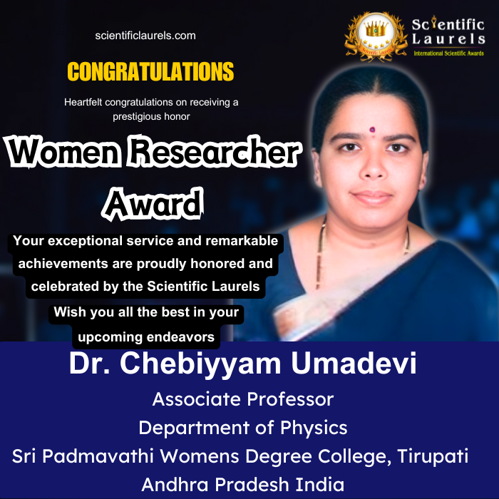 Dr. Chebiyyam Umadevi’s extensive research contributions, combined with her active participation in academic development programmes and leadership in fostering scientific knowledge, make her an exemplary candidate for the Women Researcher Award in Scientific Laurels. Her dedication to research in material science and polymer thin films for energy storage, along with her demonstrated excellence in teaching and mentoring, underscores her eligibility for this prestigious recognition.