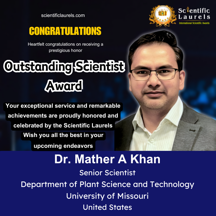Dr. Mather A Khan's groundbreaking research in plant iron homeostasis, biofortification, and precision nutrient management, combined with his extensive mentoring, international collaborations, and high-impact publications, makes his an ideal candidate for the Outstanding Scientist Award in Scientific Laurels. His sustained contributions to plant sciences demonstrate leadership, innovation, and global scientific impact.