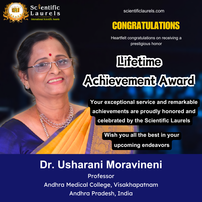 Dr. Usharani Moravineni’s decades-long commitment to medical education, her leadership in physiological research, editorial contributions, and her rich portfolio of academic service and awards make her a highly deserving recipient of the Lifetime Achievement Award in Scientific Laurels. Her work has bridged the gaps between physiology, integrative medicine, and medical education, leaving a lasting impact on both clinical practice and academic development in India and beyond.
