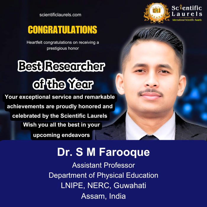 Dr. Sm Farooque is an accomplished Physical Educationist and sports science researcher with a strong academic foundation and a distinguished record of scholarly and athletic achievements. He earned his Master’s degree in Physical Education with a Gold Medal (2018–19) from the Department of Physical Education, Tripura University, and ranked 3rd position in his Bachelor’s degree examination from the Department of Physical Education, Manipur University.