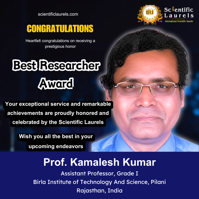 In recognition of his outstanding contributions to geotechnical engineering, research, and academic excellence, Prof. Kamalesh Kumar is eligible to receive the "Best Researcher Award" in Scientific Laurels.