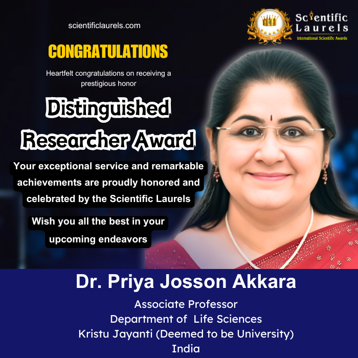 With her 27 years of impactful academic, industrial, and research experience, Dr. Akkara has consistently advanced scientific knowledge and sustainable innovations. Her high-quality publications, patented research, and global collaborations in biotechnology, pharmacology, and sustainability establish her as a leading researcher in life sciences. Combined with her awards, leadership in academic governance, mentorship, and community-focused sustainability initiatives, Dr. Priya Josson Akkara’s profile exemplifies excellence in both scientific research and academic leadership — making her highly eligible for the Distinguished Researcher Award in Scientific Laurels.